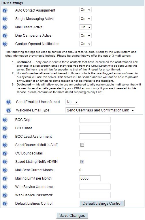 Mail Blasts Active - If set to ON, this will allow you to send e-mails to a specific subset of leads that match a particular search criteria. You can run a search within the "Contacts List" section in CRM and then use the "Mailblast" button at the bottom of the page to send an e-mail to all of the leads that match your search criteria. This setting needs to be set to ON for Single Messaging to work, as it is a form of a Mail Blast.