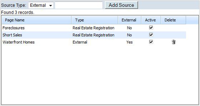 The Source section at the bottom of this page shows your Internal and External Sources. Your Internal Sources (External = No) are all "NEW IDX Listings" pages on your website that you currently have setup for Registration Access, or "My Form" pages that you currently have set to "Create CRM account". You can also add External Sources, which are used to identify where your leads are coming from, if not from one of your "NEW IDX Listings" pages that you currently have setup for Registration Access, or "My Form" pages that you currently have set to "Create CRM account" (ie: from a non-COOLSite website, etc...). You can add an External Source by entering a name into the box provided and then clicking on the “Add Source” button.