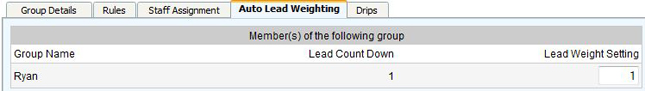 Here you determine how many leads get assigned to your Staff (ie: The Staff that you moved over to the "Assigned Staff" section under the "Staff Assignment" tab) during a given round. You can prioritize who gets the majority of the leads that come into this particular group, by entering a number under the "Lead Weight Setting" column for each Staff.