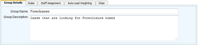 Group Description: Defines what the group represents (ie: Leads that are looking for Foreclosure homes).