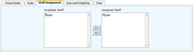 Here you will see a list of your staff (if using a multi-user setup) under "Available Staff". You can assign one or more Staff to handle leads from this particular group, by selecting the Staff from the "Available Staff" select list and then clicking the ">>" button to move them over to the "Assigned Staff" section.