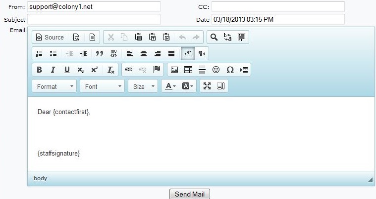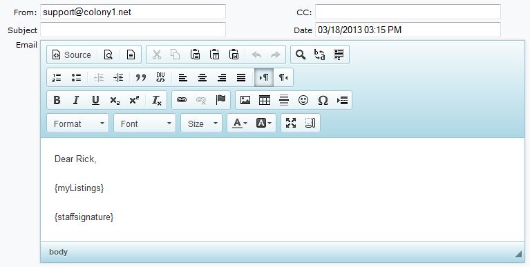 Email - On this tab, you will be able to send an e-mail directly to your lead. You can also use predefined Tokens to automatically populate content in your e-mail, such as the first and last name of the lead. This will allow your e-mail to be personalized and will also save you the time of having to type out full information.