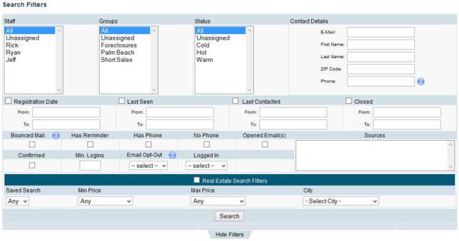 You can use these Search Filters to view a specific subset of leads and can also send a Mailblast to this particular subset of leads if you would like to do so.