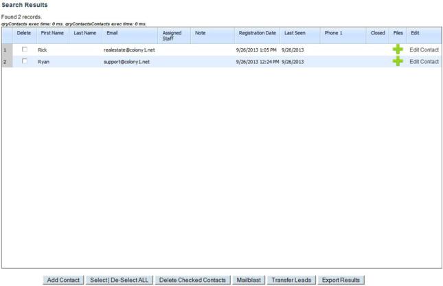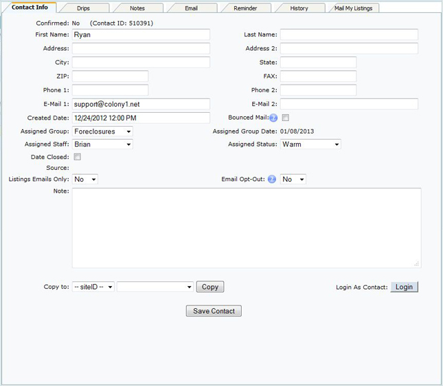 You can double-click on any lead in the grid to view and/or edit their contact information, send them an e-mail, view their Saved Searches, etc... See below for more information on each tab.